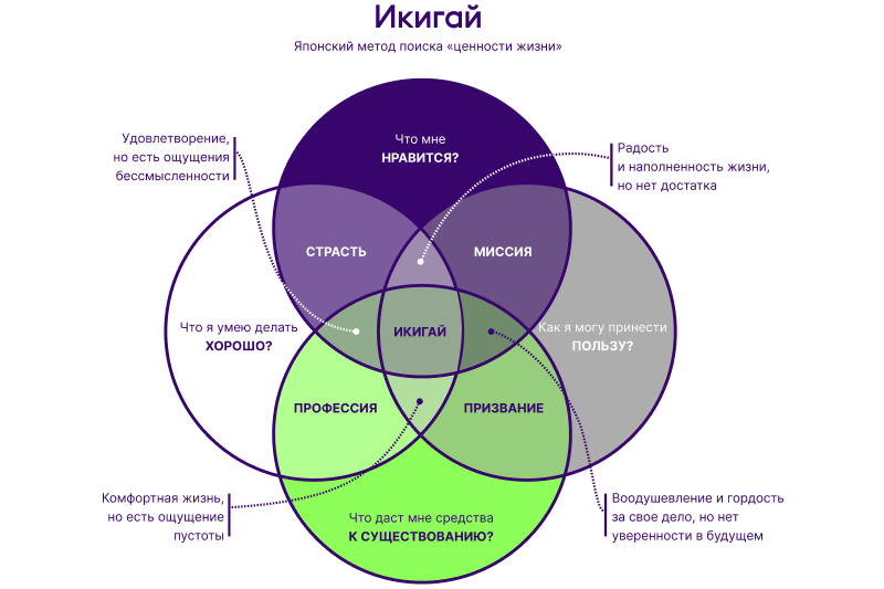 Икигай — японская концепция поиска смысла жизни, основанная на пересечении четырех элементов: