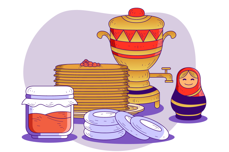 Блины — это не просто угощение, это ритуал. Всю неделю их пекут в огромных количествах, носят соседям, угощают прохожих. Рецепты у каждой семьи свои: тонкие кружевные на молоке, пышные дрожжевые, гречневые с ореховым привкусом. К блинам — сметана, икра, варенье, солёная рыба, творог. Главное правило: стол не должен пустовать.